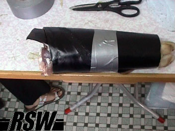 A leather wrapped pork arm was prepared for testing.